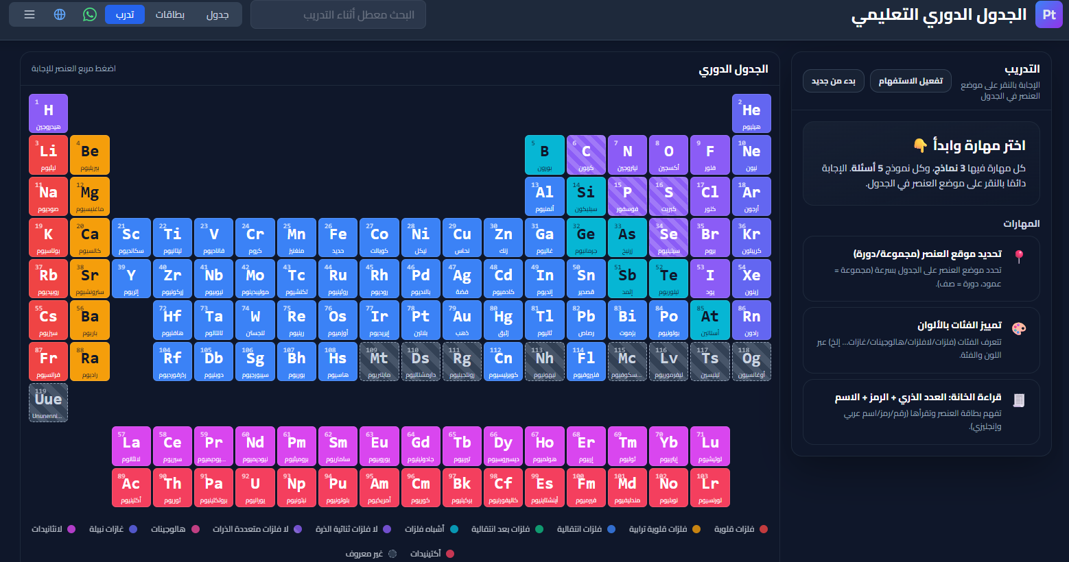 - تمييز الفئات بالألوان: اختيار عنصر من فئة محددة لتقوية مهارة التصنيف والعائلات الكيميائية.